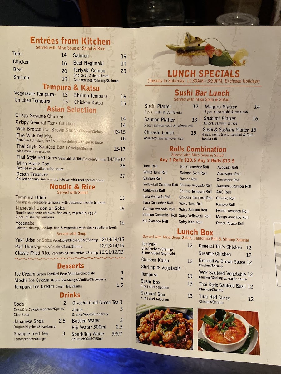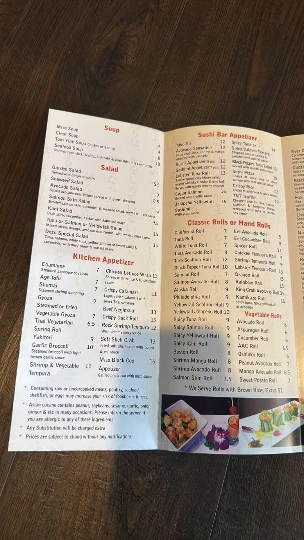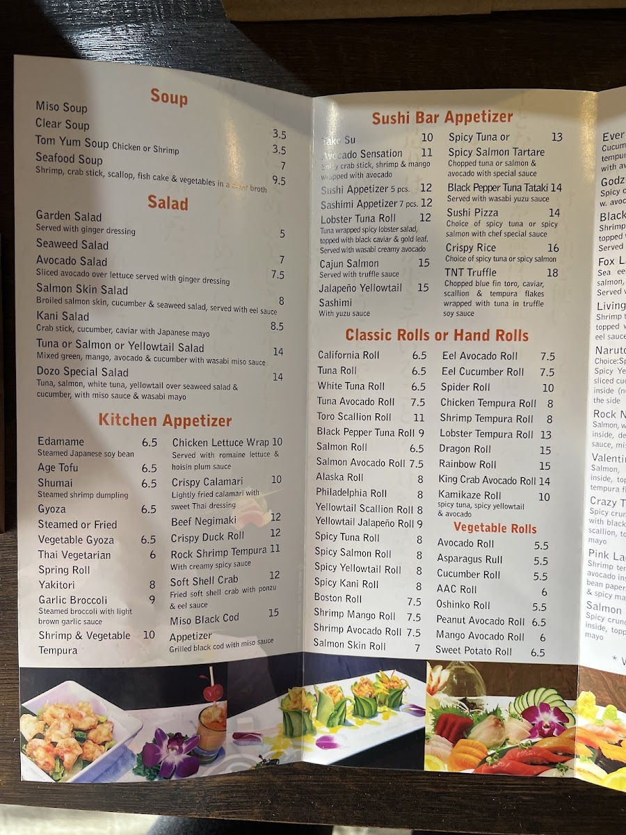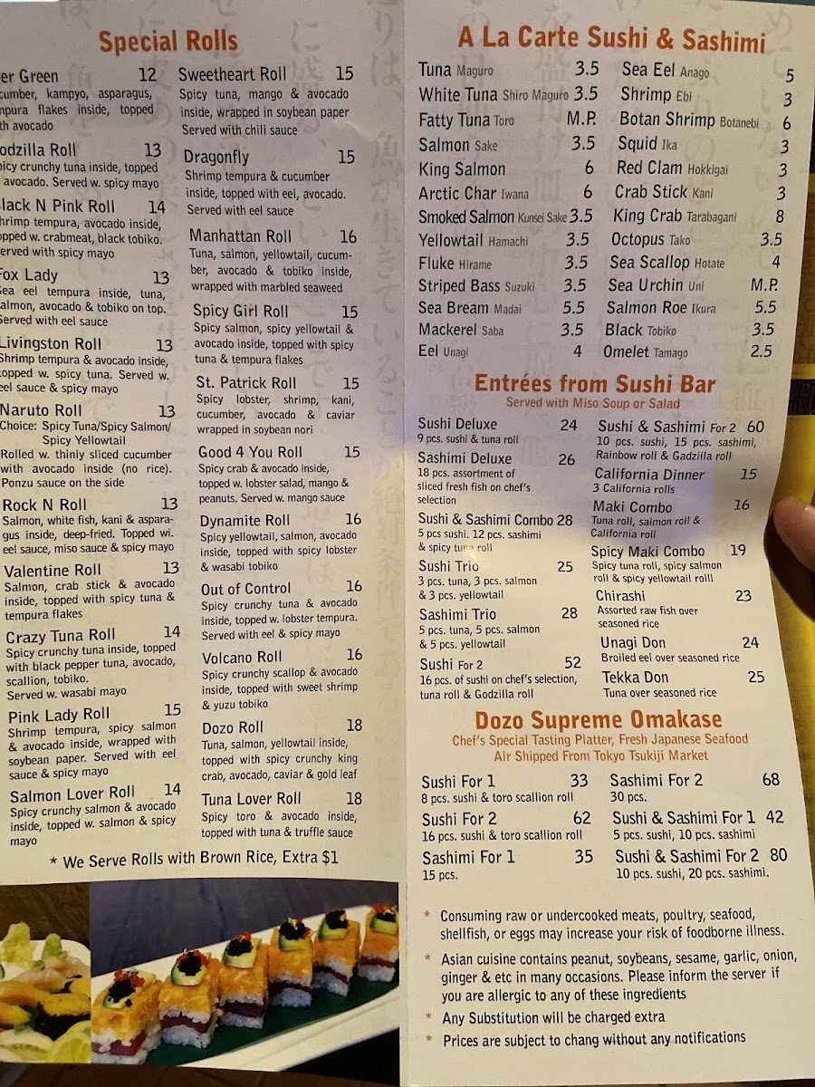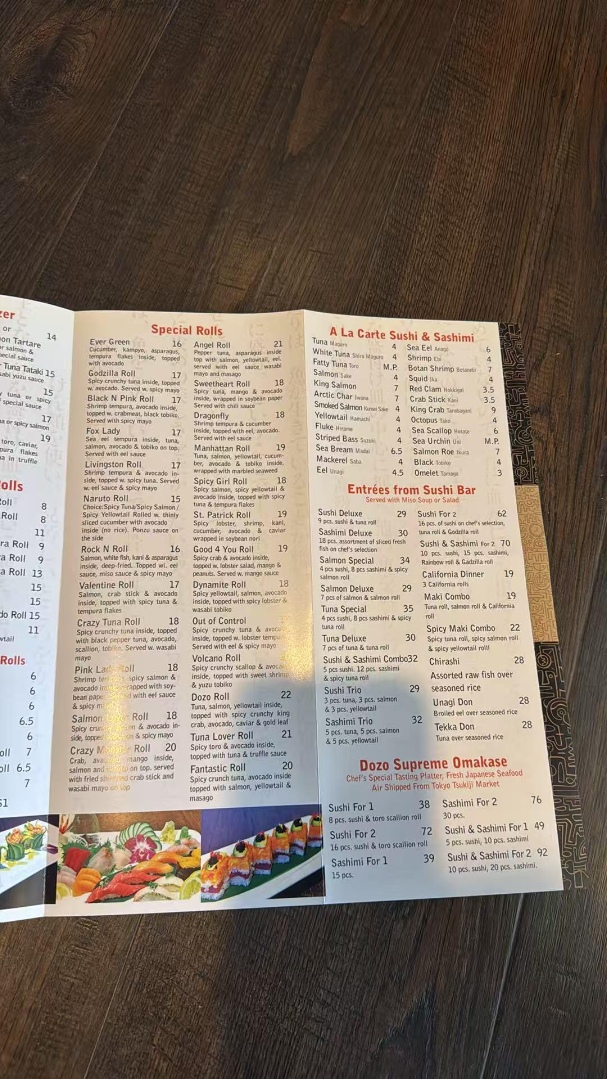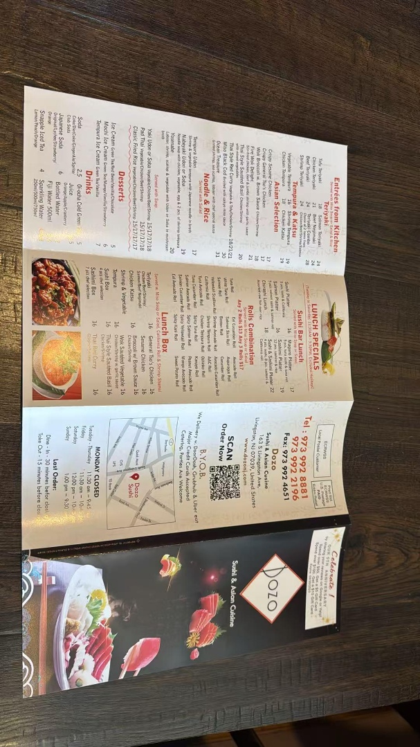 The menu at Dozo Sushi Asian Cuisine offers a delightful mix of Japanese and Asian-inspired dishes, with something for every taste. For those seeking unique rolls, the Out Of Control Roll and Ever Green Roll stand out, while the Manhattan Roll and Spicy Tuna Avocado NarutoGood 4 You Roll cater to sushi lovers looking for bold flavors. If you’re in the mood for a sushi platter, the Sushi Platter or Maguro Platter make excellent choices, and the Chirashi Lunch is perfect for a light but satisfying meal. The restaurant also offers a variety of side orders like Ginger Dressing (Pint) and Sushi Rice (L) to complement any dish. For a heartier option, the Miso Black Cod (D) or General Tso Chicken from the Asian selection is a flavorful choice. Spicy Tuna Tartare and Crispy Rice Avo Only are standout appetizers, while those who enjoy a more traditional sushi experience can indulge in Tuna Sashimi and Sea Bream Sashimi. The Beef Negimaki (D) or Chicken Katsu from the Teriyaki/Katsu/Temp menu also promise a satisfying meal. The Basil Shrimp Box and Chicken Teriyaki Box are great lunch box options, and for dessert, the Mochi Ice Cream or Tempura Ice Cream provides a sweet ending to your meal. Whether you’re craving sushi, sashimi, or a comforting noodle dish like Beef Yaki Udon, Dozo Sushi’s menu offers a wide variety to please all tastes.